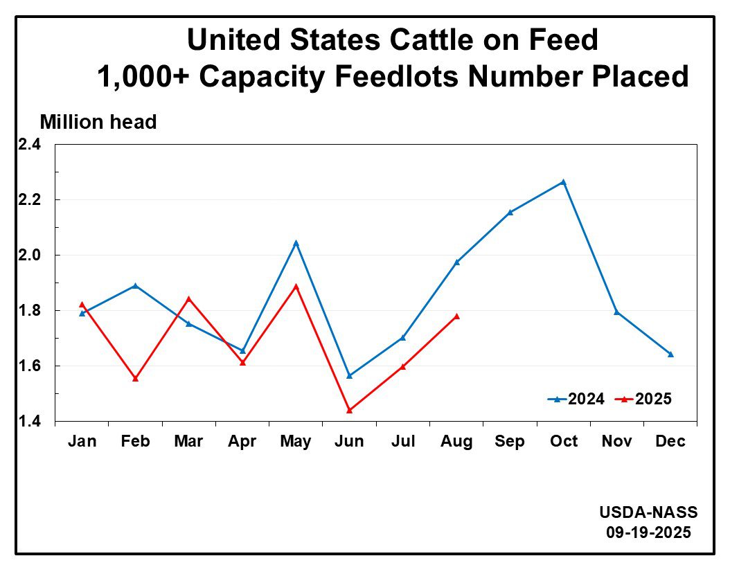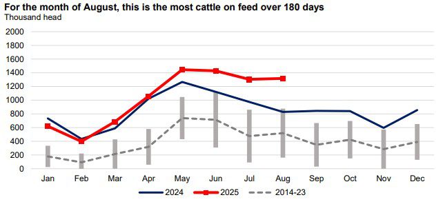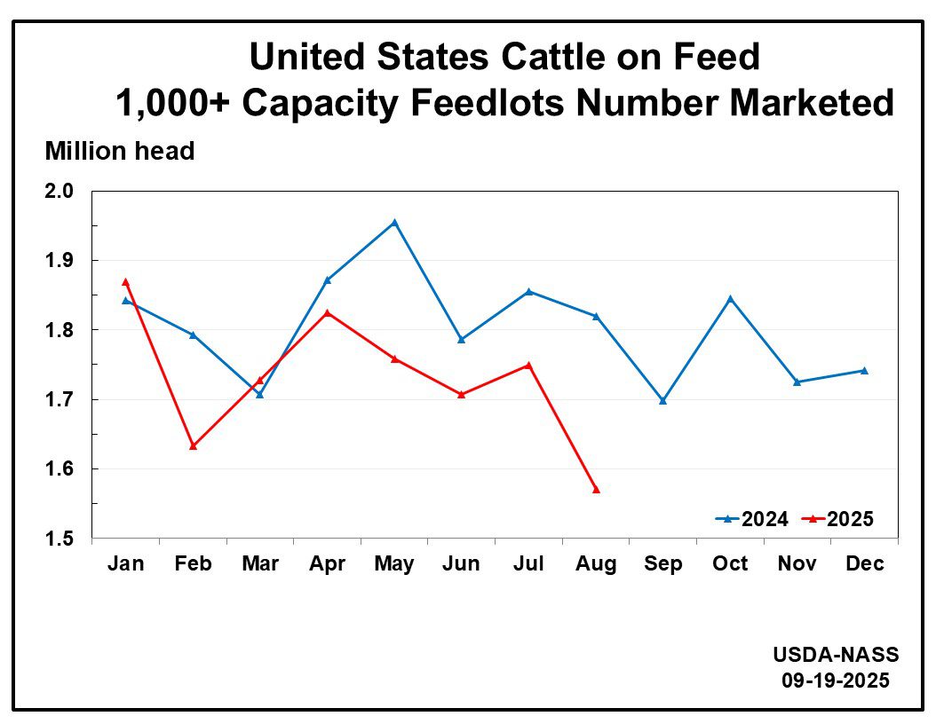 4월 이후 마케팅 속도의 둔화가 가속화되었습니다(7월과 8월의 미국 사료용 소 마케팅은 각각 6%와 14% 감소). 이로 인해 미국 사료용 소의 시장 출시 준비가 된 공급이 늘어났습니다.