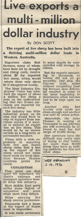 생양 수출업은 연중 내내 양을 구매했으며, 새로운 시장이 등장하고 거래량이 증가함에 따라 양 거래량도 증가했습니다. 호주육류산업노동조합(Australian Meat Industry Workers Union)은 1970년대 중반, 생양 수출이 호주 일자리를 창출한다고 주장하며 생양 거래에 대해 점점 더 강경하게 대응했습니다. 이는 서호주와 동부 지역 가축 사육장과 부두에서 피켓 시위로 이어졌고, 결국 연방 정부는 생양 한 마리를 수출할 때마다 더 많은 양의 도체를 선적해야 하는 쿼터제를 도입했습니다.