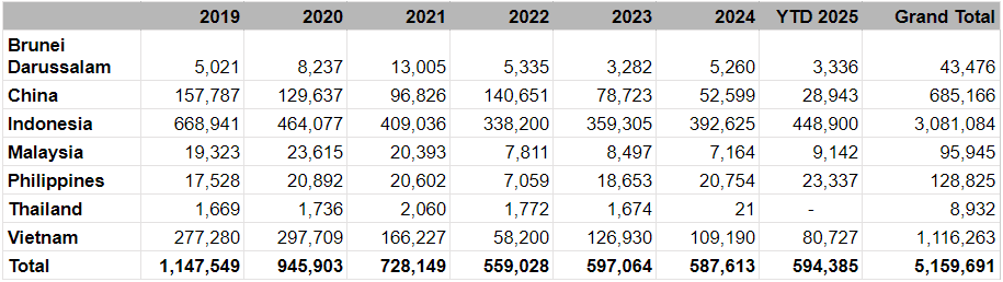 2025년 동남아시아 시장별 소 수출량 비교