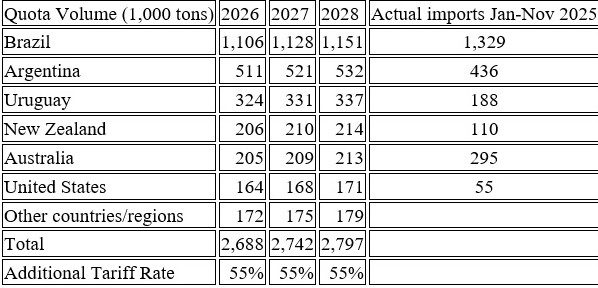 중국, 브라질, 호주에 주요 수출을 하는 국가들은 2025년 선적량 수준보다 훨씬 낮은 할당량을 부여받았습니다.