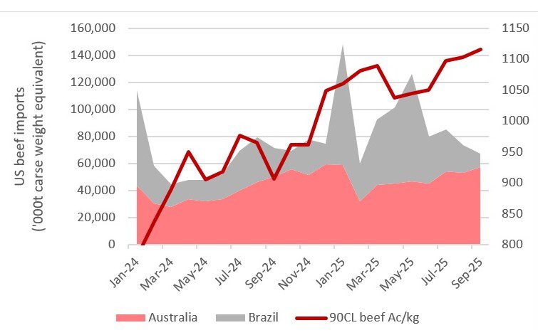 2025년 이 기간 동안 호주는 브라질산 쇠고기 수입과의 경쟁 심화에 직면했는데, 당시 미국산 저지방 가공 쇠고기 가격은 kg당 9~9.5달러였으며, 이는 현재의 kg당 약 12달러와 비교됩니다.