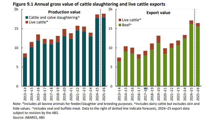"2025~2026년에 살아 있는 소의 수출 가치는 2% 감소하여 9억 4,100만 달러에 그칠 것으로 예상됩니다. 이는 주로 퀸즐랜드 북부의 유리한 계절적 조건으로 인해 살아 있는 육우 사료/도축용 소 수출 수가 감소한 데 따른 것입니다."