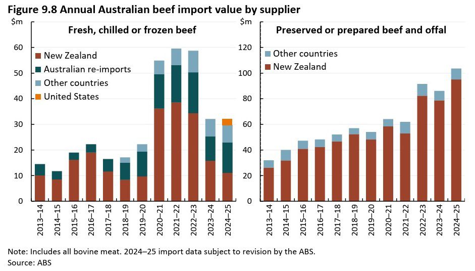 ABARES는 9월 농업 상품 보고서에서 그래프(아래)를 발표했는데, 그래프의 주황색 막대는 미국에서 호주로의 "신선, 냉장 또는 냉동 쇠고기" 수입이 2024~25년 중에 시작되었음을 명확히 보여줍니다.