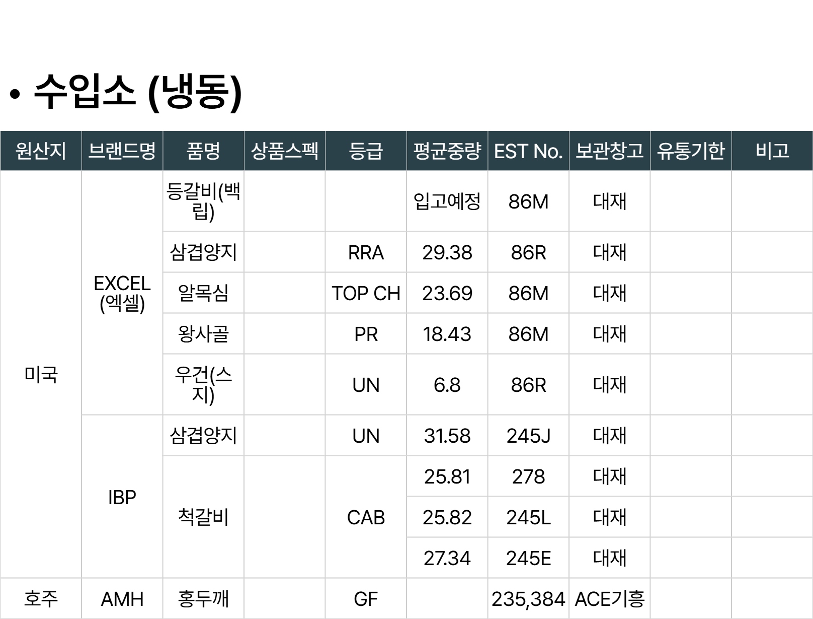 - IBP / 등급: CAB / EST: 245L / 평중: 25.82 / 창고: 대재