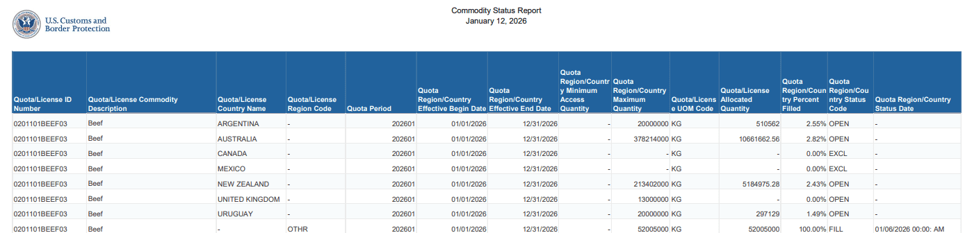 어젯밤 발표된 미국 관세국경보호국의 최신 주간 보고서에 따르면, '기타 국가' 할당량으로 미국 시장에 서비스를 제공하는 브라질이 1월 6일 기준으로 해당 할당량을 모두 소진한 것으로 확인되었습니다.
